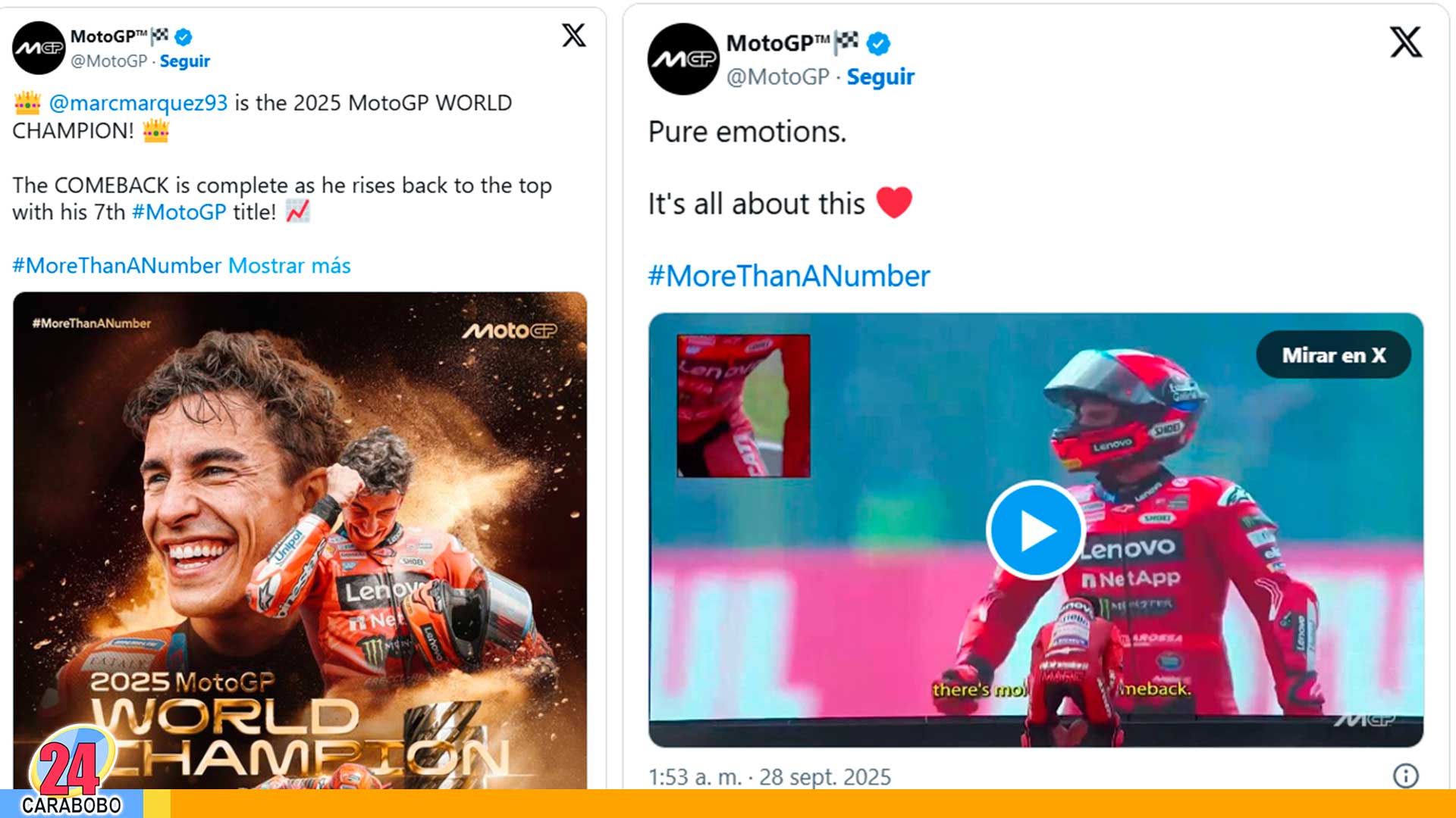 “Implacable. Intrépido. Imparable. A pesar de las lesiones, el dolor y la duda, ahora todo ha vuelto”, escribió la cuenta oficial de MotoGP en sus redes sociales, donde también recopiló imágenes de las lesiones de Márquez y el camino que lo llevó a reconquistar el título.