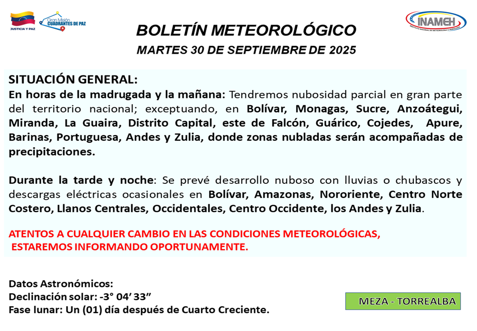 En horas de la mañana habrá nubosidad parcial en gran parte del territorio nacional; al exceptuar en Bolívar, Monagas, Sucre, Anzoátegui, Miranda, La Guaira, Distrito Capital, este de Falcón, Guárico, Cojedes, Apure, Barinas, Portuguesa, Andes y Zulia, donde zonas nubladas serán acompañadas de precipitaciones, reseña el boletín del Instituto Nacional de Meteorología e Hidrología (Inameh).